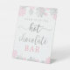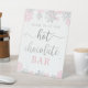 Baby shower moderne, enseigne de piédestal chocolat chaud avec motifs des flocons de neige en parties scintillant d'hiver rose et argent avec le texte "chocolat chaud"