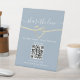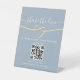 Élégant panneau de table code QR de mariage blanc et bleu poussiéreux simple « Share The Love » avec cœur de corde en faux or et écriture calligraphique moderne.