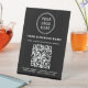 Panneau de piédestal de table noir moderne pour votre entreprise avec votre code QR pour que les clients scannent pour effectuer un paiement, pour une liste de vos produits, services et prix, pour des rendez-vous, pour s'inscrire, etc. Téléchargez votre logo et votre code QR et ajoutez le nom de votre entreprise, votre numéro de téléphone, votre adresse ou d'autres informations dans une typographie blanche simple.