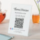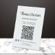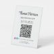 Panneau de tablette de piédestal moderne pour votre entreprise avec votre nom présenté dans un script de signature élégant et type d'entreprise en lettrage simple. Entrez l'adresse de votre site Web pour créer un code QR que les clients et les clients peuvent rechercher pour les rendez-vous, les produits, les services, les heures, etc. Ajoutez vos identifiants instagram et facebook pour que les clients puissent vous suivre sur les médias sociaux. Vous pouvez ajuster la taille du script en modifiant l'outil de conception pour des noms plus longs ou plus courts.