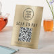 Panneau de piédestal moderne pour votre entreprise avec votre code QR pour que les clients scannent pour le paiement. Ajoutez votre logo, code QR, numéro de téléphone et adresse en typographie simple sur un fond métallisé doré faux brossé.