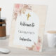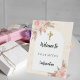 Marbre doré, couleur pêche imprimé comme arrière - plan décoré d'une croix dorée, d'une pelouse de pampas et de fleurs roses rousses et d'un cadre en arc blanc. Personnalisez et ajoutez un nom.