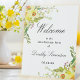 Bienvenue à votre 60ème anniversaire avec cet élégant panneau de bienvenue jaune jonquille. Un luxuriant arrangement de fleurs bleues est placé au sommet. L'accueil est écrit dans une grande police tendance. Le reste du texte est une combinaison classique d'une police droite et d'une police italique. Très facile à customiser. Ce panneau est facile à utiliser et peut être placé dans une variété d'emplacements.