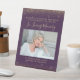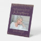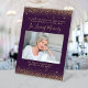 Un élégant signe pour honorer un membre de la famille défunt à votre mariage. Les mots "In Loving Memory" apparaissent en calligraphie manuscrite couleur or sur un arrière - plan violet, avec texte modifiable en police serif. Une bordure de parties scintillant en faux or orne le haut et le bas du panneau. Remplacez facilement l'exemple d'image par une photo horizontale de votre être aimé.