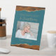 Un élégant signe pour honorer un membre de la famille défunt à votre mariage. Des bordures d'agate d'orange brûlée et de rouille bordées de parties scintillant en faux or ornent le dessus et le bas d'un arrière - plan bleu turquoise. Les mots "In Loving Memory" apparaissent dans la calligraphie de l'écriture manuscrite de couleur or, avec le texte modifiable dans la police serif. Remplacez facilement l'exemple d'image par une photo horizontale de votre être aimé.