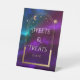 Sweets and Tras Cosmic Purple Turquoise Gold Sun Lune Astronomie Espace Mariage Événement Piédestal Signal présente soleil doré, lune et étoiles avec un cadre doré sur un arrière - plan cosmologique coloré et mystique, violet, turquoise et bleu. À l'intérieur, il y a votre texte personnalisé. Conçu pour vous par Evco Studio www.zazzle.com/store/evcostudio