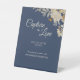 Ce mariage Boho d'automne bleu Dusty capte le panneau de piédestal d'amour combine une ambiance antique avec un look fleur sauvage bohème rétro. Les élégants fleurs sauvages beiges neutres, en plus de l'arrière - plan bleu poussiéreux, marine, avec sa typographie calligraphique classe, permettent un thème formel mais sauvage et fleuri, style vintage de célébration du mariage.