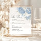 An elegant Dusty Blue & White floral wedding bar menu pedestal sign, featuring a soft watercolor hydrangea bouquet and refined modern classic typography.
