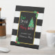 Eat, drink and be merry holiday party featuring a Christmas tree and gifts against a gold frame. Black and white striped background with holly