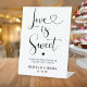 Dirigez vos invités vers la table des desserts avec cet adorable et élégant présentoir Love Is Sweet de la collection de scripts en forme de cœur. La calligraphie surdimensionnée avec un élégant flourish en forme de cœur et le message "Please Take a Treat" crée un centre de table chaleureux et accueillant pour la station des douceurs lors de votre réception de mariage ou de votre douche de mariée. Les noms des mariés et la date apparaissent en bas dans une typographie sans empattement en gras coordonnée. Tout le texte est entièrement personnalisable.