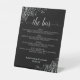 This tabletop sign is a great way to let your guests know the bar menu at your wedding reception. It features a simple yet elegant design with silver faux foil curls and swirls on a classic black background. The title is written in fancy script calligraphy with swashes on the ends of the letters and reads: The Bar. There is space for your drinks menu as well as the names of the couple and wedding date.