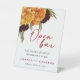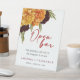 A chic and modern table sign for your wedding reception featuring a vibrant floral corner design with rich burgundy, deep orange, and golden marigolds and greenery. The sign clearly announces an "Open bar" in an elegant red script, with a playful phrase: "THE DRINKS ARE ON US, the hangover is on you." It is personalized with the couple's names and the wedding date, making it a stylish and witty addition to your bar area.