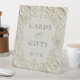 Elegant Floral Antique Ivory Cards & Gifts Wedding Pedestal Sign. Elevate your wedding reception with this exquisite embossed style antique ivory pedestal sign. The detailed floral and scrollwork border adds a touch of timeless elegance, perfect for guiding guests to your cards and gifts station. This chic freestanding sign features elegant lettering that reads 'Cards & Gifts' with room for the bride and grooms custom initials at the bottom, creating a beautiful focal point for your special day. Its classic design complements various wedding themes, from vintage to romantic, ensuring a seamless integration with your décor. Make a sophisticated addition to your gift table and ensure your guests know exactly where to leave their well wishes and treasures.