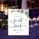 Une enseigne de livres d'hôtes aux couleurs vives et aux couleurs vives, avec un beau feuillage botanique vert aquarelle et des feuilles d'eucalyptus. Améliorez votre décor mariage grâce à cet élégant panneau de piédestal à fleurs jaune, bleu et blanc mariage. Doté d'un design sophistiqué orné de fines fleurs jaunes, de fleurs blanches douces et d'élégants accents bleus, ce panneau dégage un charme et une romance intemporels. La typographie raffinée et les aquarelles aérées créent une esthétique fraîche et élégante, ce qui en fait un lieu idéal pour accueillir les clients, afficher des sièges ou mettre en évidence des détails importants. Idéal pour les mariages du printemps et de l'été, les fêtes de jardin ou les lieux de campagne, ce guéridon magnifiquement conçu ajoute une touche d'élégance et de sophistication à votre journée spéciale.