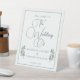 Un script de calligraphie verte tout simplement élégant avec deux feuilles d'eucalyptus aquarelle de chaque côté au fond pour décorer cette belle chute minimaliste Bienvenue à Notre guéridon Mariage. Décor chic et moderne mariage du soir pour un jardin en soirée.