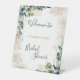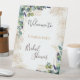 Bienvenue à un élégant mariage. Un fond blanc chic. Décoré de feuilles d'eucalyptus aquarellées vertes, de brindilles, de verdure, de feuilles dorées fausses et de taches de paillettes dorées. Personnalisez et ajoutez le nom de la future mariée. Lettres noires et dorées.