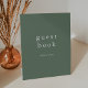 Ce panneau de livres d'hôtes mariage simple et moderne de la Collection Emelia est parfait pour un mariage ou un événement de destination boisée. Le design vert sauge foncé présente une typographie rustique et simple avec une atmosphère de montagne boisée.