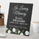 Un élégant mémorial funéraire de célébration de la vie signe avec des fleurs blanches.