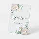 Fond blanc. Décoré de pivoine blanche, fleurs, feuilles d'eucalyptus aquarellées vertes, brindilles, feuillage, feuilles dorées fausses. Avec le texte : Faveurs, prenez-en une !