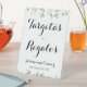Un letrero de mesa de boda blanco y verde para tarjetas de dinero y regalos