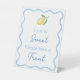 L'amour est doux, prenez un petit plaisir ! Ce panneau de table moderne à thème citrus pour la fête de mariage présente une bordure ondulée dessinée à la main dans un bleu pâle tendance avec un citron aquarellé unique. Présenté ici pour une fête de mariage, mais tout le texte est personnalisable pour votre événement, il conviendrait également pour une baby shower (les bébés sont doux, prenez un petit plaisir).