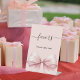Fond rose, décoré avec un grand nœud. Texte : Faveurs. Veuillez en prendre un !