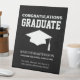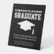 Panneau de la table moderne noire et blanche de la fête de graduation avec le texte "Félicitations diplômés", et un design de casquette de graduation. Personnalisez avec le nom et l'année de diplôme de votre diplômé. Ajoutez un petit message personnel à votre diplômé en bas. Contactez-moi pour obtenir de l'aide sur vos personnalisations ou pour demander des produits Zazzle correspondants ou coordonnés supplémentaires pour votre diplôme.
