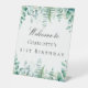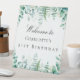 Un signe de bienvenue pour une fête d'anniversaire élégante et moderne. Un arrière - plan blanc. Décoré de verdure d'eucalyptus, fougères de bois. Personnalisez et ajoutez un nom, un âge ou un événement.