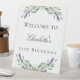 Un arrière - plan blanc chic. Décoré de fleurs de lavande, de fleurs et de verdure d'eucalyptus. Personnalisez et ajoutez le nom et l'âge/l'événement.