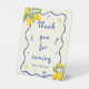 Élevez votre thème principal de douche de nuptiale pressée avec cette Fête des mariées principale personnalisée bleu jaune Squeeze Favor Pedestal Sign. Avec de charmantes illustrations au citron, ce panneau est parfait pour un écran principal de citron de douche nuptiale pressé. Ajoutant à votre thème de douche au citron nuptiale, il améliore votre décor avec une touche fraîche. Parfait pour les idées de douche nuptiale à thème citron, ce signe vient compléter les idées de douche nuptiale à thème citron italien et les idées de douche nuptiale d'été magnifiquement!