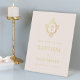 Un signe de bienvenue de baptême de fille rose et or. Au-dessus du texte, il y a une croix dans une crête vintage, toutes deux de fausse feuille d'or. L'arrière - plan est rose vif, tout le texte est doré et peut être changé. La crête florale vintage d'un ancien livre reliant, du livre "Rust, Smut Mildew & Mold", de 1870, maintenant dans le domaine public.