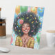 Ce guéridon de fête d'anniversaire présente une aquarelle illustrant une joyeuse fille à la peau brune rayonnant de bonheur et de fête.Elle a une afro étonnante et volumineuse, ornée de confettis colorés et de fleurs fraîches, dont des roses roses et des fleurs bleues. Son sourire rayonnant, ses yeux étincelants et ses mains claquées exsument une pure excitation et de la positivité. L'arrière - plan festif est rempli de ballons aux couleurs vives dans les tons rose, vert, jaune et bleu, et de confettis gais flottant dans l'air, créant une ambiance festive enrichissante. La chemise rayée jaune de la fille afro-américaine ajoute une pop de chaleur, en complément parfait de la scène animée.