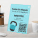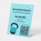 The Fitness Results Christmas Gift Certificate Pedestal Sign is part of the Electric Blue Fitness Business Cards & Marketing collection. It is designed for seasonal holiday gift certificate promotions in gyms and fitness studios. This electric blue, black, and white branded 8x10 Inch countertop promo with a kettlebell symbol and star confetti has a billboard-like effect. It has clear font for the motto, offer, and promise, as well as an indication of where to get it, an optional expiration date, and the ability to scan and purchase online or get further information. You can customize the QR code, text, and even all the element and background colors.