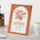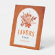 Fleurs d'automne orange vibre avec feuille et arche mariage de automne botanique Favors signe de piédestal. Ce joli design mariage dispose d'un cadre en arc sur arrière - plan orangé brûlé. Dans le cadre il y a votre texte et un bouquet de dalias et feuillage dans les couleurs d'automne.