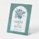 Fleurs et feuillage bleu turquoise et aqua avec des cartes botaniques en arc et des cadeaux mariage Piédestal Signal qui affiche un cadre d'arc sur arrière - plan coloré turquoise. Dans le cadre il y a votre texte et un bouquet de fleurs dalia et feuilles dans les couleurs bleues.