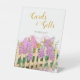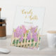 Direct guests to drop cards and gifts with this charming "She's Fresh Off The Market" bridal pedestal sign! Romantic watercolor lilac and hydrangea blooms in soft lavender, rich purple, and blush pink tones cascade over a rustic picket fence with green leaves and petals on white—ideal for garden, cottagecore, lavender-themed, or spring/summer bridal showers.