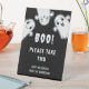 Un signe de bonbon Halloween personnalisable, idéal pour laisser les astuces ou les traiteurs savoir qu'ils peuvent prendre un gâteau ou deux. Le design présente des illustrations de Destei de personnages fantômes mignons avec différents types d'expression faciale. Il y a aussi une zone de texte personnalisable pour souhaiter Happy Halloween avec un nom. La couleur arrière - plan est noire tandis que la plupart des éléments de design sont blancs.