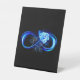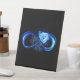 Luminous infinity symbol with glowing, beautiful, lushly blooming rose made of blue flames on black background.