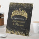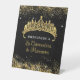 Un riche arrière - plan noir montre une tiare dorée scintillante avec des confettis en faux or qui pleuvent du haut du panneau du piédestal pour collectionner sur le fond. Parfait signe d'information ou de bienvenue pour la fête la plus blingieuse de Quinceanera jamais! Cela peut aussi être customisé pour l'anniversaire de toute fille pétillante ou toute autre célébration. Disponible avec des produits correspondants.