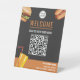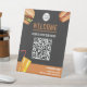 Ce design a été créé en pensant aux restaurants, diners et vendeurs de nourriture. En haut, on peut lire : "Bienvenue" avec le texte qui dit : "Analyser pour voir notre menu". En dessous, il y a un grand code QR. Sur le pied de page il y a de l'espace pour un nom d'entreprise et quelques informations de contact. Un logo d'entreprise peut être placé sur le dessus. Dans trois coins, il y a des illustrations de Destei sur la restauration rapide. L'une montre une partie d'un hamburger tandis que l'autre montre une partie d'un hot dog qui a du ketchup et de la moutarde sur le dessus. En bas à gauche, on trouve une illustration d'une boisson jaune qui contient une paille rouge. La couleur générale de l'arrière - plan est gris foncé, presque noir, tandis que la couleur du pied de page est orange muet. Personnalisez ce modèle pour répondre aux besoins de votre entreprise.