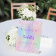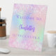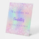 Un signe de bienvenue pour une Quinceanera girly et glamour. Un arrière - plan holographique tendance en rose, violet, vert menthe. Décoré de confettis roses. Personnalisez et ajoutez un nom. Texte mauve. Retour : aucune conception