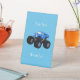 Ce mignon camion monstre bleu est prêt pour l'action de course. Camionneur de course haute octane amusant dessiné dans le style de dessin animé heureux!
