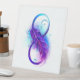 Infinity symbole with a beautiful feather painted in purple and blue bright colors on white background