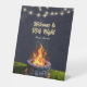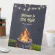 Des lumières à cordes sont enfilées au-dessus d'un foyer en pierre flamboyant contre un ciel étoilé pour accueillir vos invités à un jardin feu de camp ou à une célébration du foyer. Utilisez comme signe d'accueil ou d'information pour une fête d'anniversaire, un barbecue, une soirée de mores, un cocktail d'été ou une autre célébration, un mémorial ou une fête du travail. Disponible avec des produits correspondants.