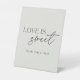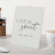 Panneau de table dessert mariage sur mesure avec typographie de style moderne "L'amour est doux" sur arrière - plan de couleur beige douce.