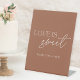 Panneau de table dessert mariage sur mesure avec typographie de style moderne "love is sweet" sur arrière - plan couleur terre cuite.