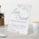 Ce joli panneau de table est parfait pour une table de régal à votre réception de mariage. Il présente un design simple mais élégant avec des lettres de script couleur violet, lilas ou lavande poussiéreuses et des remplissages de dentelle en faux feuille gris argenté dans les coins. Le panneau dit : L'amour est doux, s'il vous plaît prenez un régal! Il y a de la place pour vos noms et la date du mariage ci-dessous.