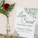 Ce joli panneau de table est parfait pour une table de régal à votre réception de mariage. Il présente un design simple mais élégant avec des lettres de script sophistiquées et des sprigs peints à la main de feuilles d'eucalyptus et de verdure dans les tons menthe, mousse et vert sauge. Le panneau dit : L'amour est doux, s'il vous plaît prenez un régal! Il y a de la place pour vos noms et la date du mariage ci-dessous.