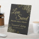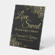 Ce joli panneau de table est parfait pour une table de régal à votre réception de mariage. Il présente un design noir et or simple mais élégant avec des lettres de script et des remplissages de dentelle en faux film doré dans les coins. Le panneau dit : L'amour est doux, s'il vous plaît prenez un régal! Il y a de la place pour vos noms et la date du mariage ci-dessous.
