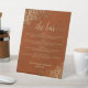 Ce panneau de table est une excellente façon de faire connaître à vos invités le menu du bar à votre réception de mariage. Il présente un design simple mais élégant avec des boucles en faux feuille doré et des tourbillons sur un arrière - plan marbré couleur rouille orange. Le titre est écrit en écriture de calligraphie en or et dit : Le Bar. Il y a de la place pour le menu des boissons ainsi que les noms du couple et de la date du mariage.